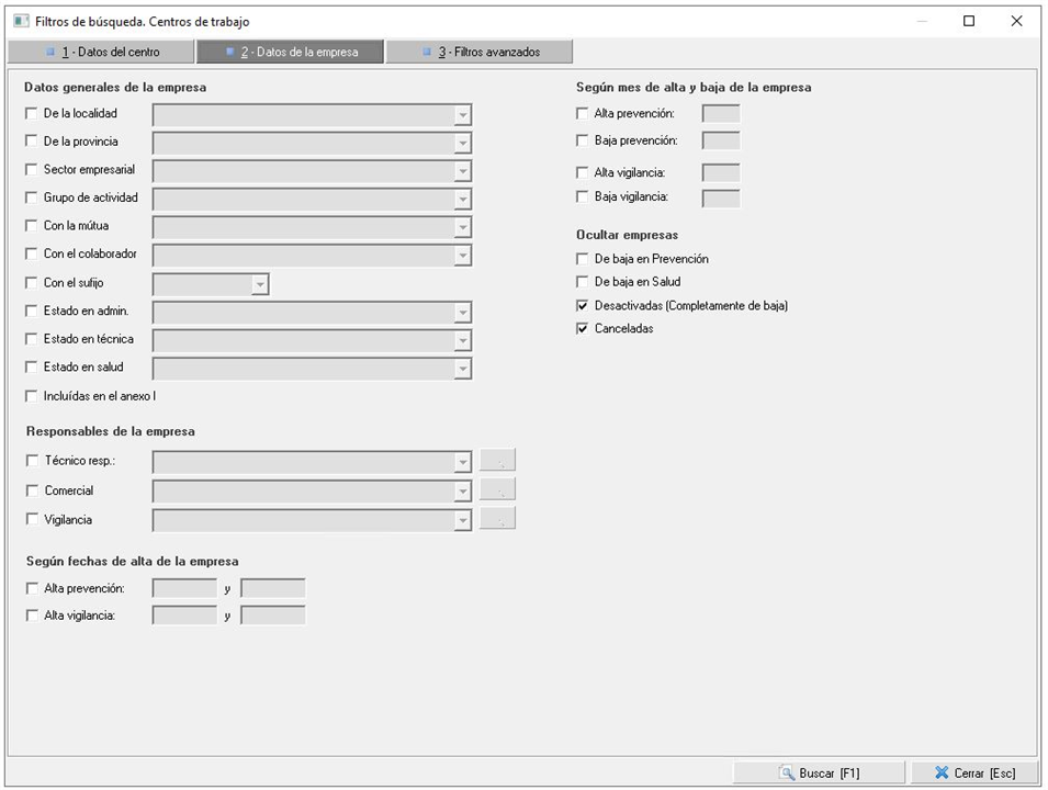 2. Datos de la empresa. En esta pestaña se podrá filtrar por datos generales de la empresa, responsables de la misma, fechas de alta. Además, se podrá marcar que se mantengan ocultas las empresas que hubieran sido dadas de baja, desactivadas o canceladas.