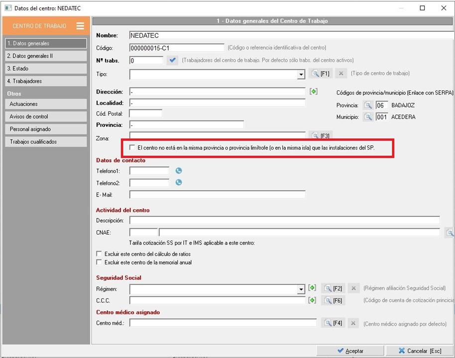 Esta opción equivale a la posibilidad de marcar o desmacar el siguiente check que encontramos en la pestaña '1.Datos generales' de la ficha del centro de trabajo: