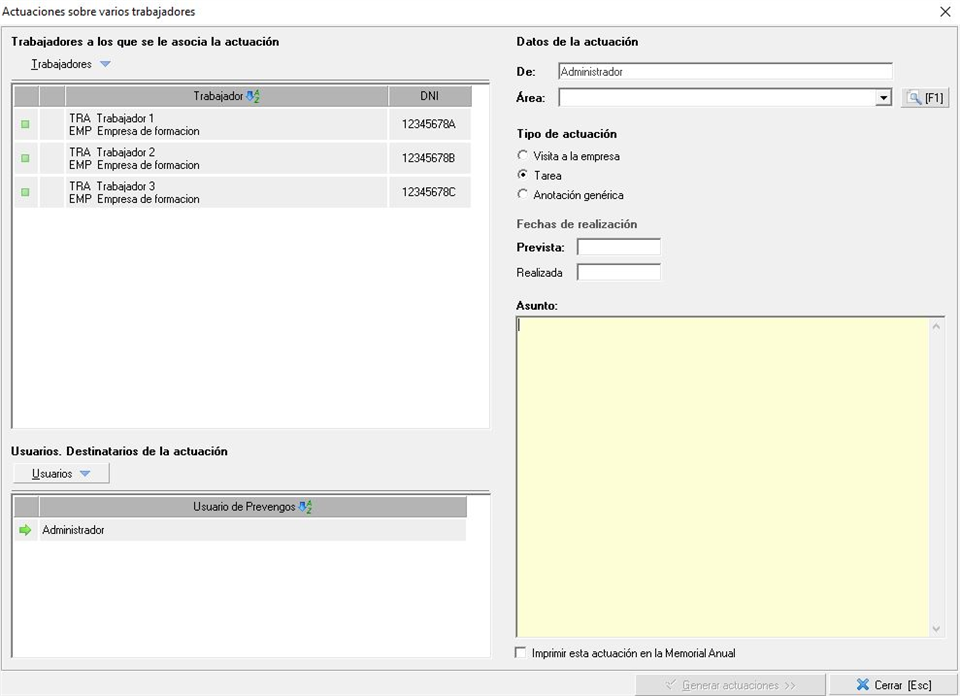 Tanto si se selecciona un trabajador o varios, se podrá utilizar la opción 'Crear actuaciones. Varios trabajadores y varios destinatarios' cuando se quiera crear una misma actuación sobre uno o varios trabajadores que pueda ir dirigida a uno o varios destinatarios o responsables. En este caso se abrirá una ventana similar a la siguiente.