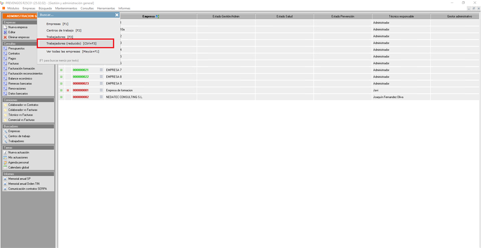 Desde distintos módulos de Prevengos, el usuario también podrá acceder a un buscador reducido de trabajadores que puede encontrar en el menú superior 'Búsqueda', seleccionando 'Trabajadores (reducido) [Ctrl+F3]'.