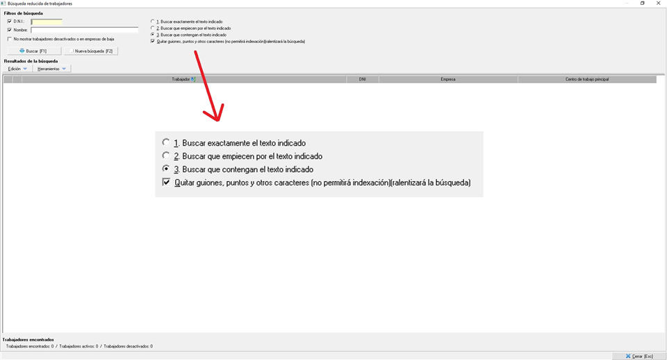 - Buscar que contengan el texto indicado. Esta opción se marcara por defecto, pudiendo el usuario modificarla por cualquiera de las anteriores. Se buscarán todos aquellos trabajadores en cuyo nombre aparezca el texto escrito, con independencia de su orden. Hay que destacar la utilidad de esta opción para aquellos casos en los que tengamos que buscar a un trabajador pero no recordemos si se registró como 'Nombre Apellido1 Apellido 2' o 'Apellido1 Apellido2 Nombre'.