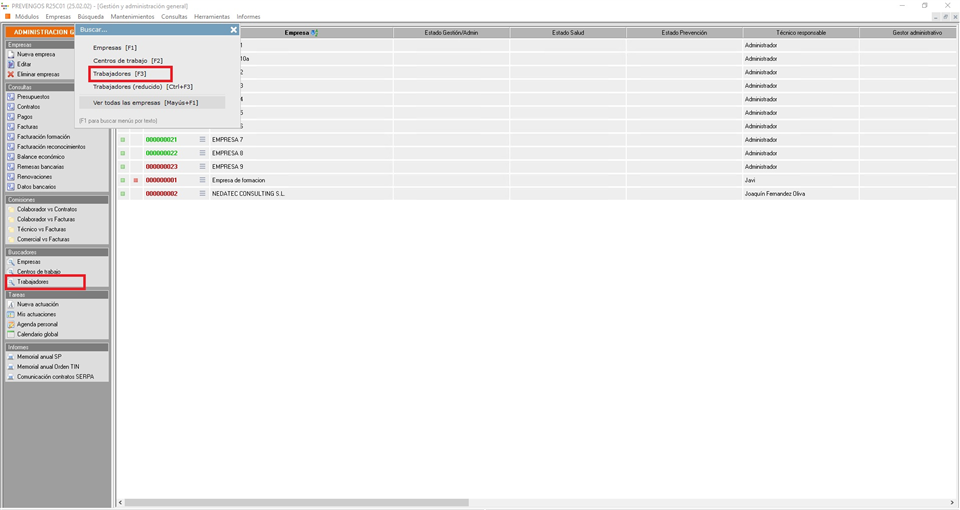 Los usuarios tienen disponible este buscador general desde los módulos de Administración, Prevención técnica, Investigación de accidentes, Vigilancia de la salud y Entrega de EPIs. En todos estos módulos el usuario podrá acceder al buscador mediante dos vías: desde el menú superior 'Búsqueda', seleccionando 'Trabajadores [F3]', o bien desde el acceso directo 'Buscadores/Trabajadores' que aparece en el panel izquierdo del módulo. A continuación se muestra una imagen del módulo de Administración donde se señalan ambos accesos.