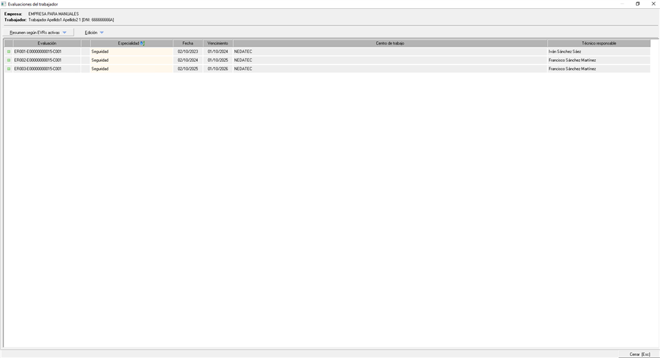 - Evaluaciones. Esta pestaña nos llevará a una nueva pantalla, como la que se muestra a continuación, donde se podrán consultar todas las evaluaciones de riesgos activas en las que el trabajador hubiera sido incorporado. También se podrán consultar, desde el menú desplegable 'Resumen según EVr activas', los riesgos del trabajador, EPIs, formación e información requerida según dichas evaluaciones.