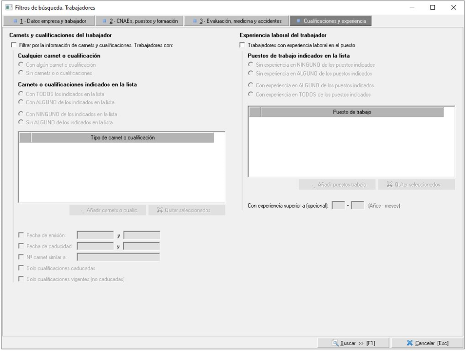 4. Cualificaciones y experiencia. Se podrán filtrar trabajadores que posean cualquier carnet o cualificación o los que se añadan de los que hayan sido registrados en Prevengos, y por trabajadores que posean experiencia laboral en un puesto de trabajo.