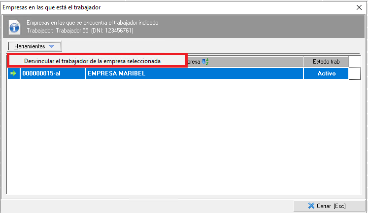 - Ver empresas en las que está el trabajador. Si seleccionamos esta opción, se abrirá una ventana donde aparecerá la relación de empresas a las que pertenece el trabajador y su estado en las mismas (activado o desactivado). Además, se podrá desvincular al trabajador de dichas empresas desde el menú 'Herramientas' como se muestra en la siguiente imagen.