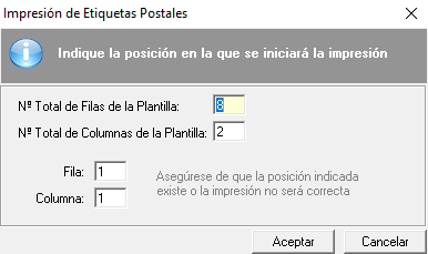 - Generar etiquetas postales. Se podrán generar etiquetas postales para uno o varios de los trabajadores. Al seleccionar esta opción se abrirá una pequeña ventana donde podremos indicar la posición de la impresión. En concreto, se podrá señalar el número de filas y de columnas de la plantilla.