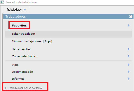- [F1] Búsqueda de menús por texto. Una vez desplegado el menú 'Trabajadores', si pulsa sobre su teclado [F1] podrá buscar rápidamente la opción que necesite, escribiendo el texto, sin necesidad de ir abriendo pestañas.