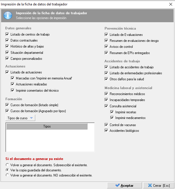 - Vigilancia de la salud. Se podrán consultar y crear nuevos reconocimientos, incapacidades temporales, consultas, vacunas y accidentes biológicos para el trabajador que se hubiera seleccionado.