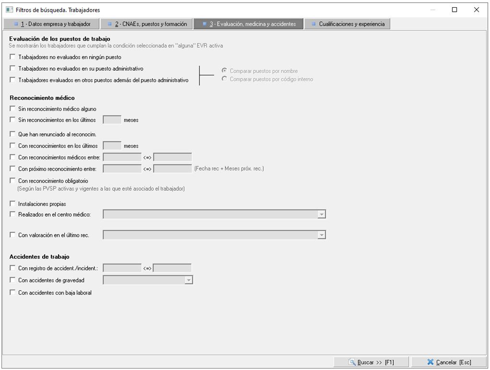3. Evaluación, medicina y accidentes. Se podrán aplicar filtros para que se muestren trabajadores cuyo puesto de trabajo hubiera sido o no evaluado, que se hubieran sometido o no a un reconocimiento médico, así como trabajadores que hubieran sufrido un accidente de trabajo o incidente.