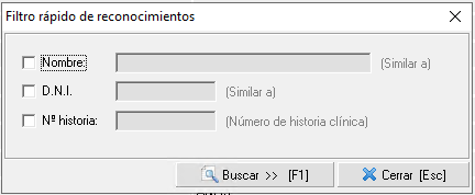 - Búsqueda rápida [F2]. Con esta búsqueda rápida nos aparecerá un pequeño formulario (similar al que se muestra en la siguiente imagen) donde podremos aplicar únicamente tres filtros: nombre del trabajador, DNI y nº de historia clínica.