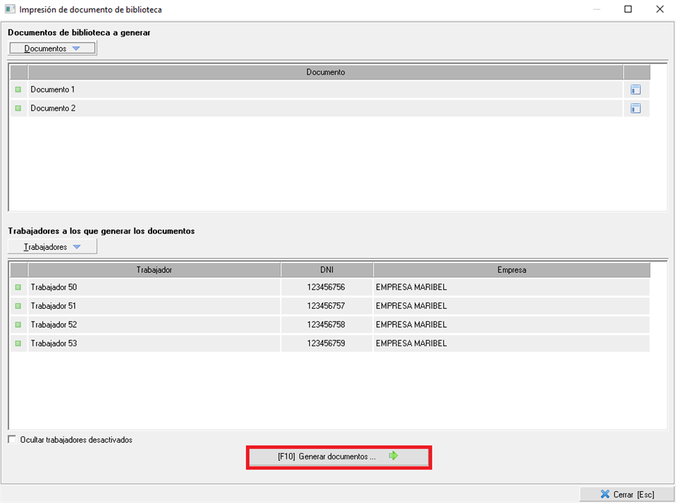 Si se seleccionan uno o más trbajadores del listado obtenido, se podrán generar uno o más documentos de la biblioteca, pulsando [F10] sobre el teclado o seleccionando la pestaña inferior '[F10] Generar documentos...