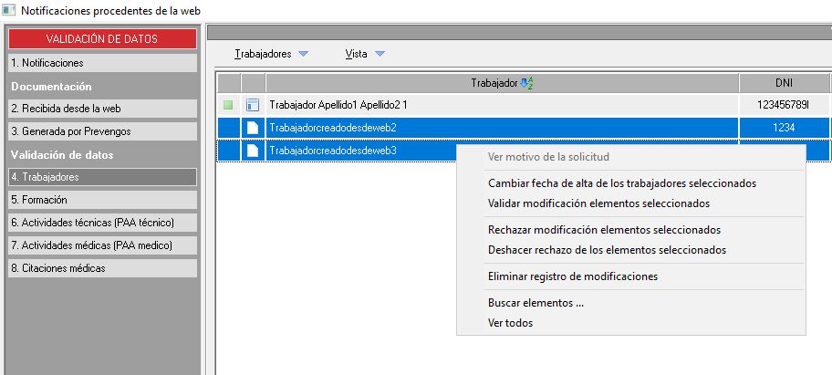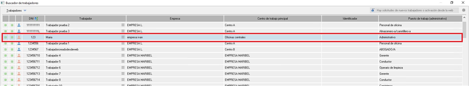 Si la empresa modificara los datos de algún trabajador previamente creado, éste aparecerá sombreado de azul, como se muestra en la siguiente imagen. Por lo tanto, el usuario de Prevengos deberá validar dichas modificaciones.