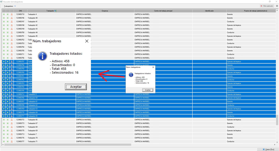 Al igual que en otros listados de Prevengos, pulsando en el teclado [Ctrl+T] se abrirá una pequeña ventana donde se indicará el número total de trabajadores que aparece en el listado, el número de trabajadores que se encuentran activos, número de desactivados, así como el de los trabajadores que se hayan seleccionado antes de pulsar [Ctrl+T].