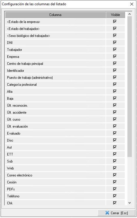 Una vez obtenida la lista de trabajadores que resulten de la búsqueda, se podrán configurar las columnas a visualizar en el icono