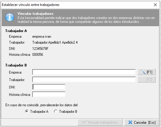 - Vincular trabajador con el mismo en otra empresa (enlazar trabajadores). Esta acción nos permitirá unificar trabajadores, es decir, se podrá indicar que dos trabajadores creados en dos empresas distintas son en realidad la misma persona, compartiendo algunos de los datos introducidos. En caso de que algunos de estos datos no coincidan, se podrá indicar que prevalezcan los datos de uno de esos trabajadores.