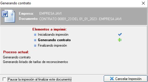 Cuando generamos un documento, una ventana nos muestra el proceso en el que el gestor de impresión va montando el documento usando la plantilla y subplantillas correspondientes hasta generar el documento final, como comentamos al principio del manual. Este proceso impresión se mostrará con una ventana similar a la siguiente imagen: