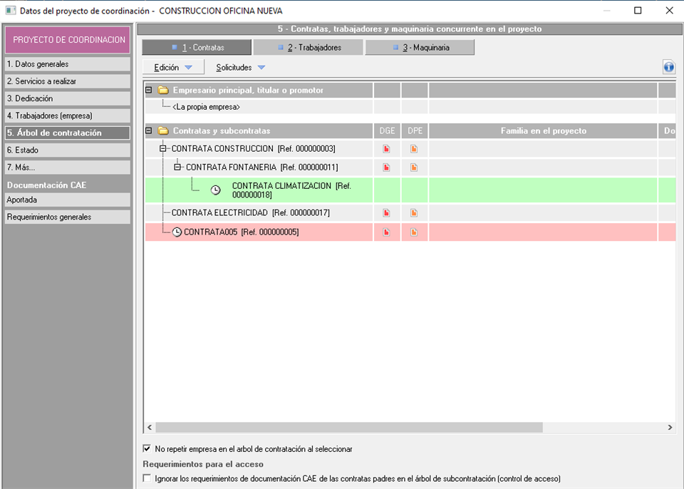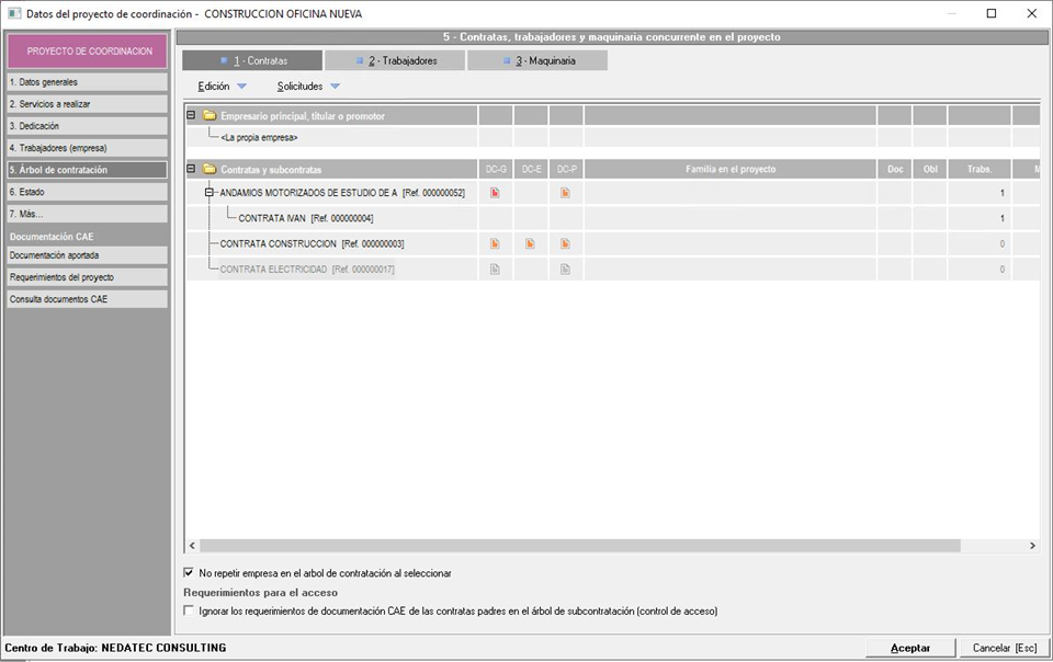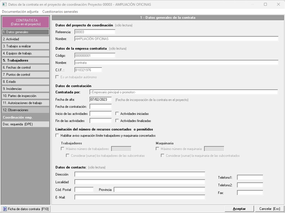 Este es uno de los apartados más importantes del un proyecto de coordinación de actividades empresariales, ya que será en el que se gestionarán las empresas externas o contratas que participarán en el mismo. Aquí es donde habrá que indicar si una contrata actúa como contratista principal o como subcontrata de otra, además de especificar otros datos concretos, como por ejemplo, las actividades que realizará la contrata en el proyecto, los trabajadores y máquinas que aporta al proyecto, o la documentación específica que se requiere para el proyecto.