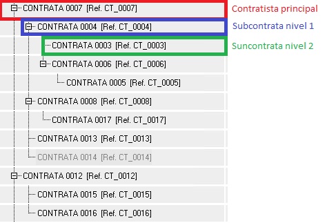 Como se puede apreciar en la siguiente imagen, la subcontratación queda reflejada en los niveles que se observan en el árbol de contratas.