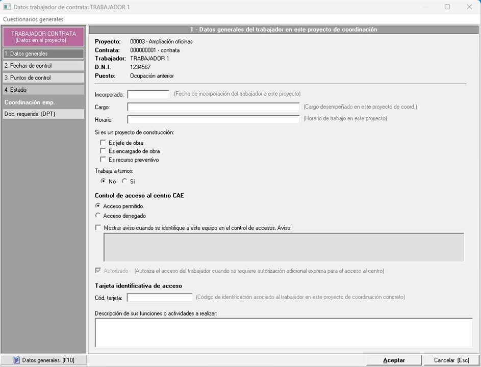 - Control de acceso al centro CAE. Estos campos se utilizarán para controlar el acceso del trabajador al proyecto. Si el acceso está permitido, se comprobará el estado de la documentación para validar o rechazar definitivamente el acceso del trabajador. En cambio, si está denegado, no se comprobará nada y se denegará directamente el acceso.