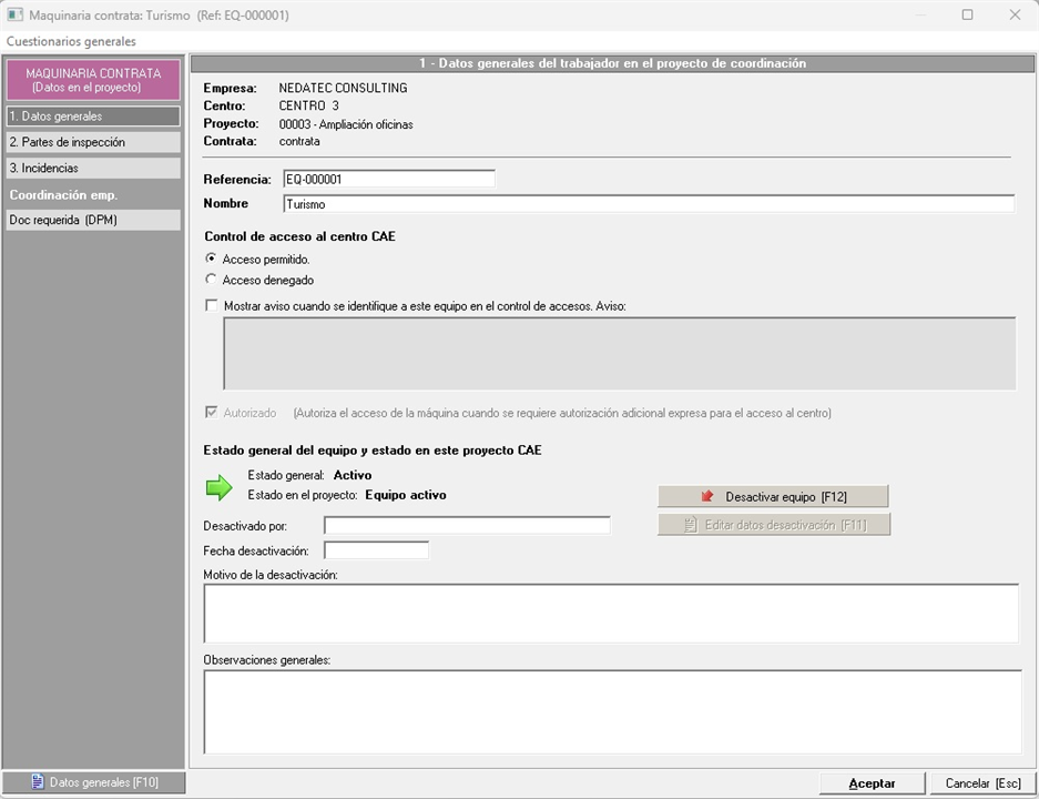 - Control de acceso al centro CAE. Estos campos se utilizarán para controlar el acceso del equipo de trabajo al proyecto. Si el acceso está permitido, se comprobará el estado de la documentación para validar o rechazar definitivamente el acceso de la máquina. En cambio, si está denegado, no se comprobará nada y se denegará directamente el acceso.