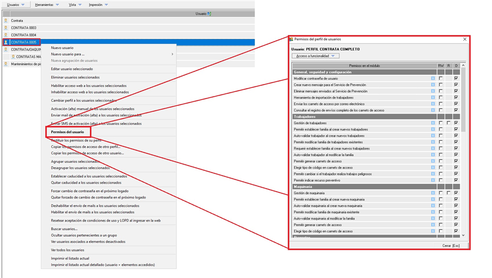 - Modificar manualmente los permisos de la contrata en cuestión, para lo que tenemos que acceder al módulo web, seleccionar el usuario de la contrata y hacer clic derecho sobre el mismo. En el desplegable, seleccionar la opción de "Permisos del usuario" tal y como vemos en la siguiente imagen: