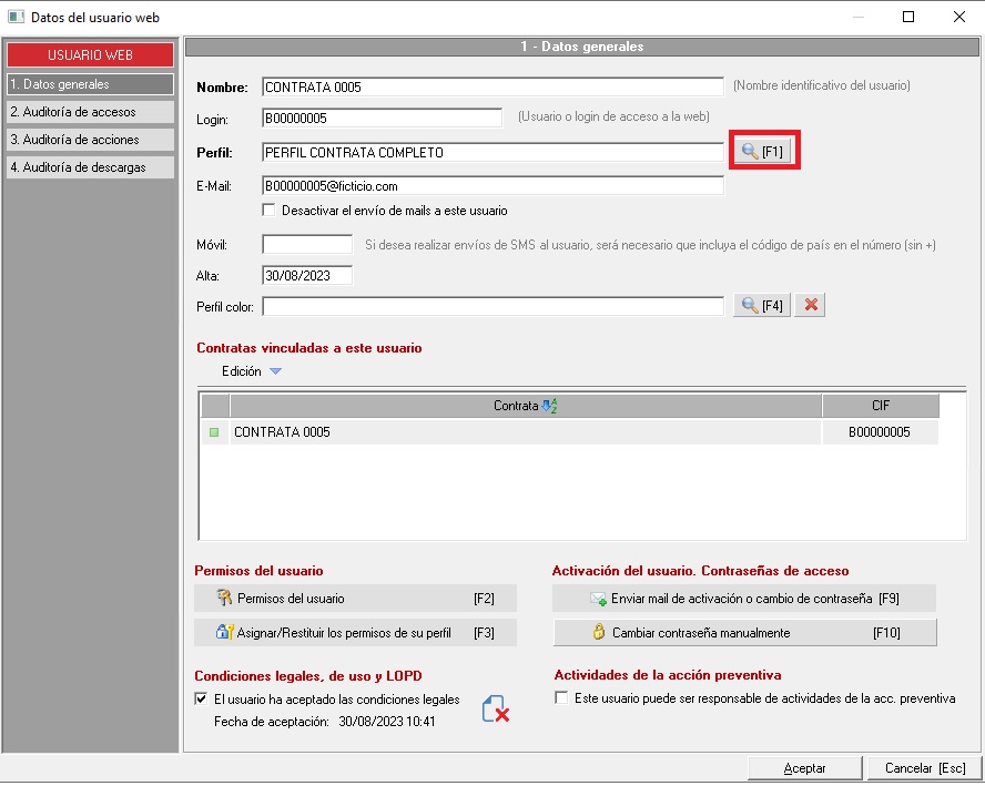 - La segunda opción es siempre y cuando trabajemos con los perfiles de usuario. Si tenemos un perfil ya creado con los permisos configurados, simplemente tenemos que asignárselo a la contrata. Para ello, desde el módulo web accedemos al usuario de la contrata haciendo doble clic sobre el mismo, en la ventana que se muestra elegiremos el perfil mediante el botón [F1] (se nos muestra el mantenimiento de perfiles para que elijamos el que queremos asignar). Tras seleccionarlo y aceptar la ventana del usuario Prevengos nos pregunta si queremos asignar los permisos del perfil, le diremos que si para aplicarlo. Estos pasos mencionados podemos verlos en la siguiente imagen: