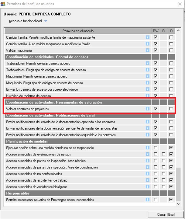 - Una vez establecidos los criterios de valoración y el peso de cada uno de ellos para calcular la nota media de la contrata, el siguiente paso es habilitárselo al usuario web de empresa en la web. Para ello existe un permiso en el rol de este usuario, simplemente debemos de habilitarlo con la posición RW. Si tiene dudas de cómo acceder a los permisos del usuario consulte este manual. En cambio, si tiene dudas sobre cuál es el permiso que tiene que habilitar, puede verlo en la siguiente imagen:
