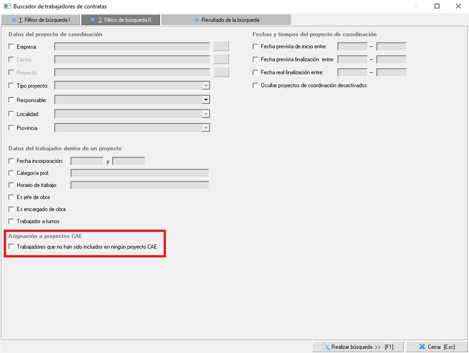 En caso de que queramos saber los trabajadores que tenemos de contratas que no están asociados a ningún proyecto existente, podemos hacerlo desde la consulta de trabajadores. Ésta la podemos encontrar dentro del módulo CAE, en el menú lateral izquierdo, dentro del bloque "Trabajadores" bajo el nombre de "Trabajadores de contrata (mantenimiento)". Una vez abierta la consulta, el filtro que nos interesa lo encontramos en la pestaña "Filtros de búsqueda II" con el nombre de "Trabajadores que no han sido incluidos en ningún proyecto CAE". Una vez marcado este check solo se tienen en cuenta aquellos trabajadores que no están incluidos en un proyecto, no obstante, podemos hacer uso de los demás filtros por si queremos afinar más la consulta, para una contrata en concreto o bajo unos criterios determinados. En la siguiente imagen indicamos donde se encuentra el filtro indicado: