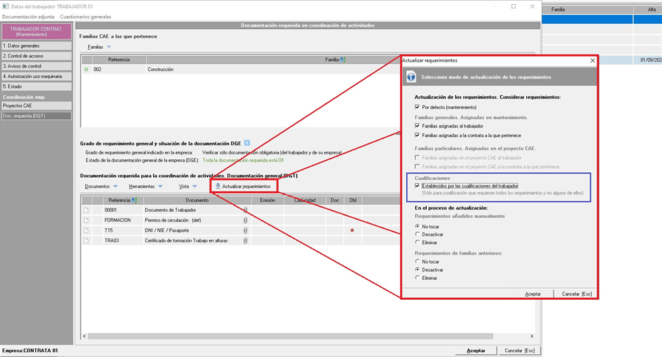 Una vez tengamos configuradas las cualificaciones en el mantenimiento debemos asignárselas a los trabajadores o maquinaria sobre los que queramos requerirlo. Para ello, accederemos a la ficha de éste y desde la pestaña "control de accesos" asignaremos las cualificaciones. Si éstas cualificaciones tienen relacionadas documentación, deberemos actualizar los requerimientos desde la pestaña de documentación requerida, tal y como vemos en la siguiente imagen: