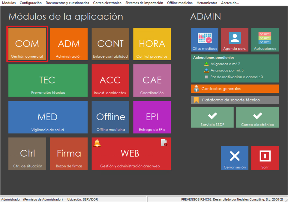 Cuando acceden a Prevengos visualizarán el escritorio de la aplicación en el que se encuentran accesos directos a todos los módulos de la aplicación. Entre estos accesos directos se encuentra el del módulo dedicado a la Gestión Comercial, representado por un rectángulo de color mostaza con las siglas 'COM' que les da acceso a este módulo. En este manual vamos a realizar una introducción general de este módulo.