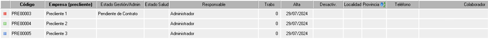 En el listado encontrará una serie de columnas con algunos datos de los preclientes y algunos iconos que le facilitarán información sobre el estado de las mismas: