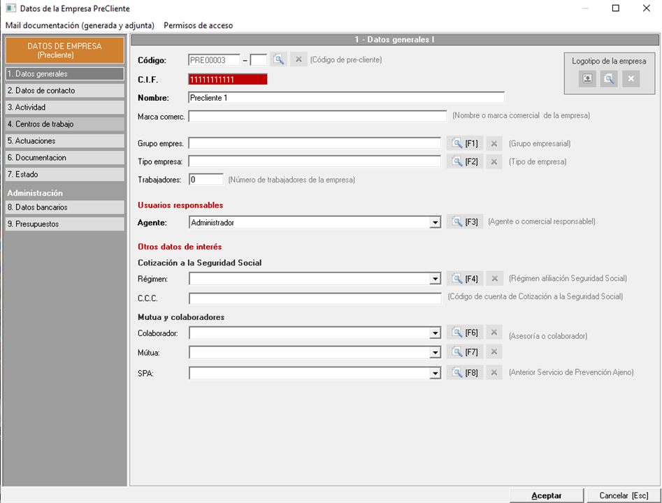Para acceder a los datos administrativos del precliente, debe acceder a la ficha general haciendo doble click sobre el mismo. En cuanto al resto de datos, corresponden a datos comunes a la Gestión General.