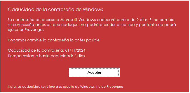 Si activa esta función, sólo editable por usuarios administradores, el sistema le notificará al iniciar Prevengos si la contraseña de su usuario de Windows está a punto de caducar en los próximos 10 días con el siguiente mensaje: