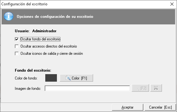 - Ocultar fondo del escritorio: Oculta la imagen establecida en el campo Imagen de fondo, quedando los iconos y el valor indicado en el Color de fondo.