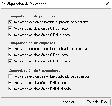 Esta configuración es editable sólo por un usuario administrador y la configuración aplica para todos los usuarios. Permite activar/desactivar las comprobaciones en preclientes, empresas y trabajadores sobre: