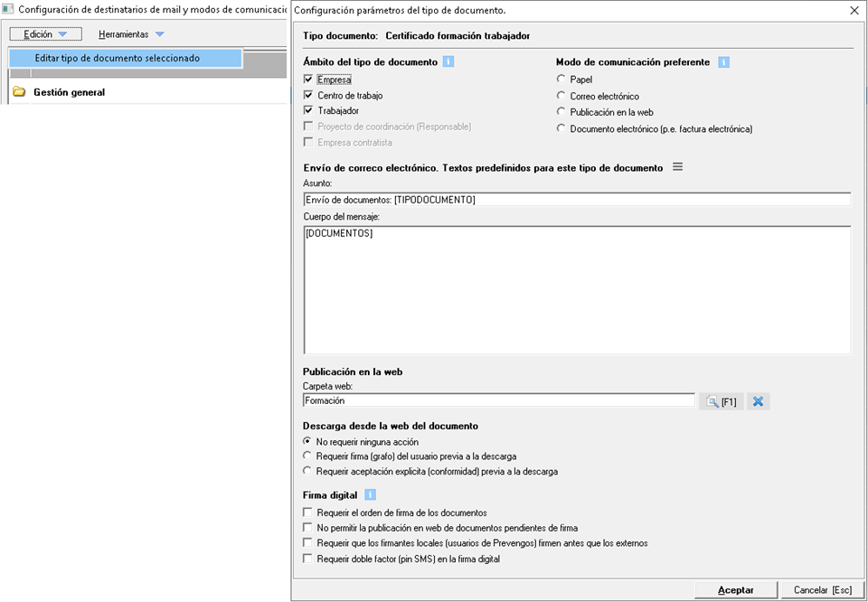 Desde el menú Editar > Editar tipo de documento seleccionado, para cada uno de los documentos tipificados, permite configurar: