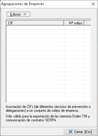 Esta configuración es sólo editable por un usuario administrador, y permite asociar CIFs (de diferentes Servicios de Prevención o delegaciones) a un conjunto de sufijos de empresa. Esta funcionalidad es para la comunicación a Serpa y las Memorias de Orden TIN.