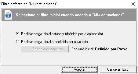 Esta configuración es editable por el usuario activo, independientemente si es administrador del aplicativo o no, y permite definir el filtro por defecto que se aplica al listado de actuaciones del apartado Mis actuaciones sólo cuando se accede desde los módulos generales.