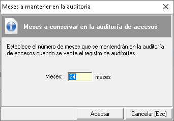 Esta configuración es editable sólo por un usuario administrador del aplicativo, y permite establecer el número de meses que se mantendrá información, de la auditoría de accesos, cuando se procede a vaciar la misma. Por defecto, si no se ha indicado, serán 24 meses.