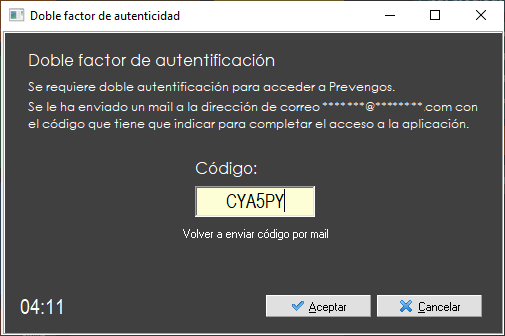 Iniciada la aplicación e introducida la clave del usuario correspondiente, el sistema 2FA envía un e-mail/sms, depende de la configuración elegida, con la clave que solicita el formulario 2FA.