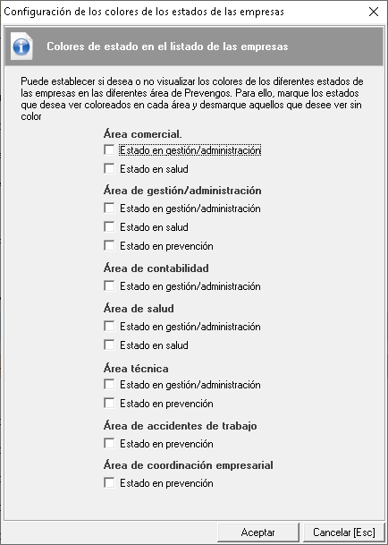 Esta configuración es editable por el usuario activo, independientemente si es administrador del aplicativo o no, y permite establecer si el usuario desea o no mostrar los colores de los estados de las empresas en los diferentes módulos de Prevengos.