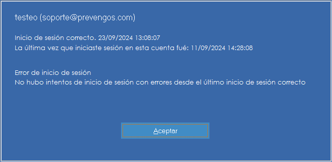 Esta configuración es editable sólo por un usuario administrador del aplicativo, y habilitada muestra información del último inicio de sesión correcto y de los inicios de sesión con errores que se hubieran producido desde el último inicio de sesión correcto.