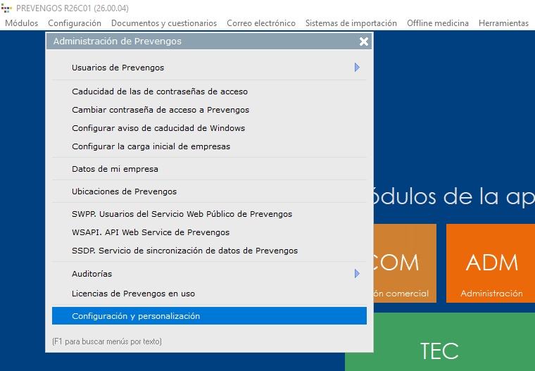 Para acceder al formulario Herramientas de configuración de Prevengos, y el bloque CONFIGURACIÓN GENERAL DE PREVENGOS, use el menú Configuración > Configuración y personalización.