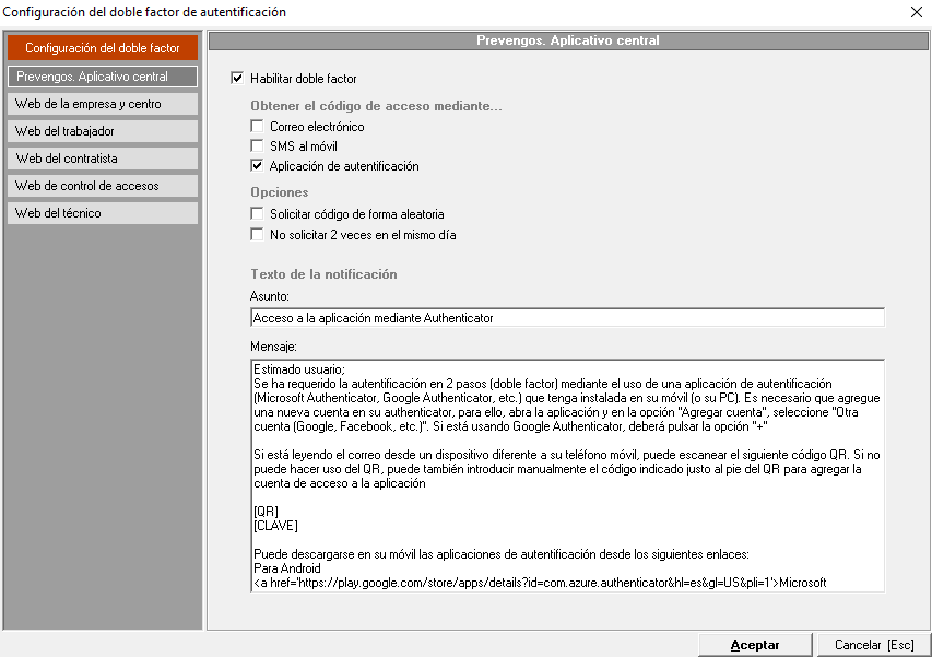 Se podrá tener activo o desactivado para el aplicativo central instalado en PC y los portales web de empresa/centro, trabajador, contratista, control de accesos y técnico mediante la opción "Habilitar doble factor". En cuanto a las opciones de envío del código de acceso son: