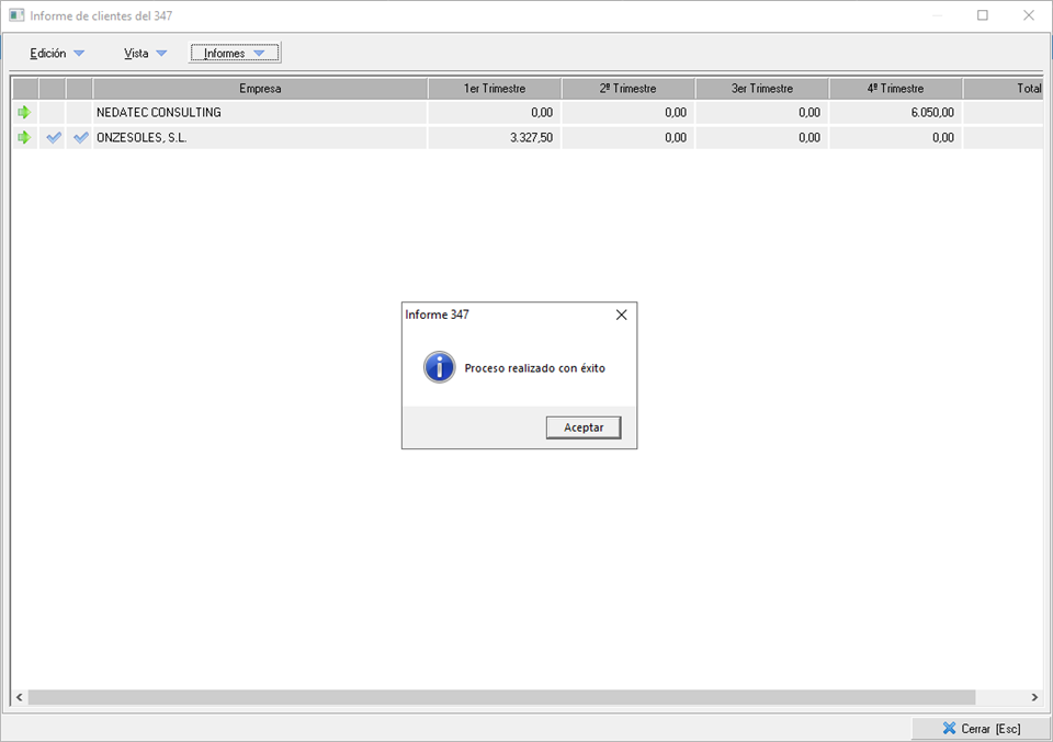 Tras el proceso se muestran en el formulario las columnas "Generación del documento 347" y "Envío por mail del documento 347" para indicar si la generación del documento y/o el envío se ha realizado con éxito