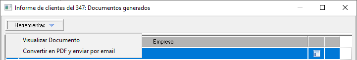 En caso de no desear el envío, abre una ventana con los documentos generados desde la que podrá enviar el informe al e-mail de contacto de la empresa con el menú 'Herramientas > Convertir en PDF y enviar por e-mail'.