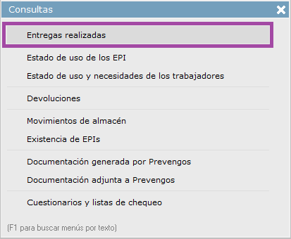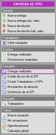 - Desde la pantalla principal del módulo de EPIs use el panel lateral izquierdo y seleccione Entregas realizadas.