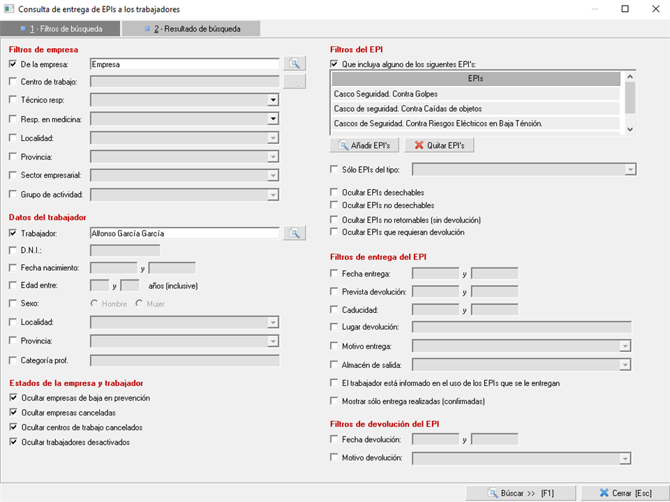 - Pestaña "1. Filtros de búsqueda". Las opciones de filtrado se dividen en dos bloques: a la izquierda se encuentran los filtros relativos al bloque de datos sobre la empresa y trabajadores, mientras que a la derecha los del bloque sobre información de los EPIs. Una vez se han seleccionado los filtros deseados, se pulsará sobre el botón "Buscar" en la esquina inferior derecha o en su defecto se pulsará la tecla [F1].