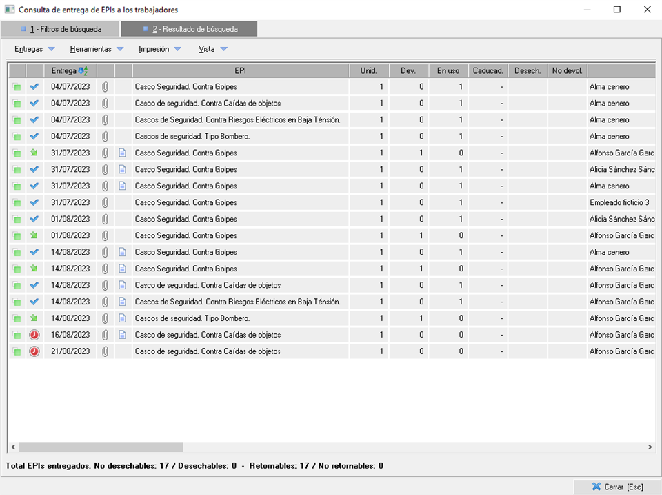 - Pestaña "2. Resultado de búsqueda". Ya en el listado se obtendrá la información de cada entrega, como es la denominación del EPI, las unidades, devoluciones, trabajadores, etc. Se diferenciarán las entregas confirmadas