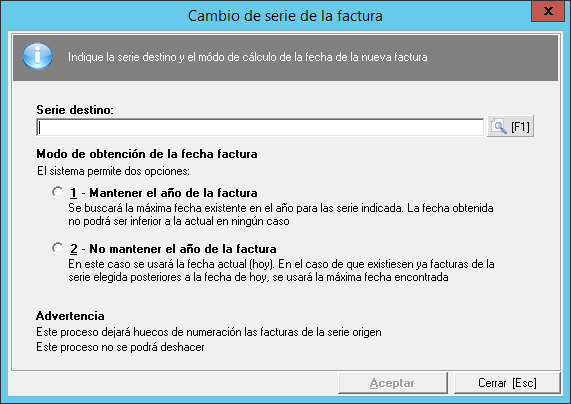 Mediante el siguiente formulario puede cambiar la serie de facturación de la factura que desee, excepto las de la serie V, con 2 opciones para la obtención de la nueva fecha: